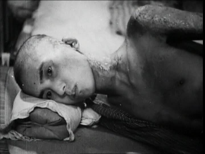 Photo of a boy, from the stock footage released by the US government, of Atomic Bomb survivors in Japan 1945.